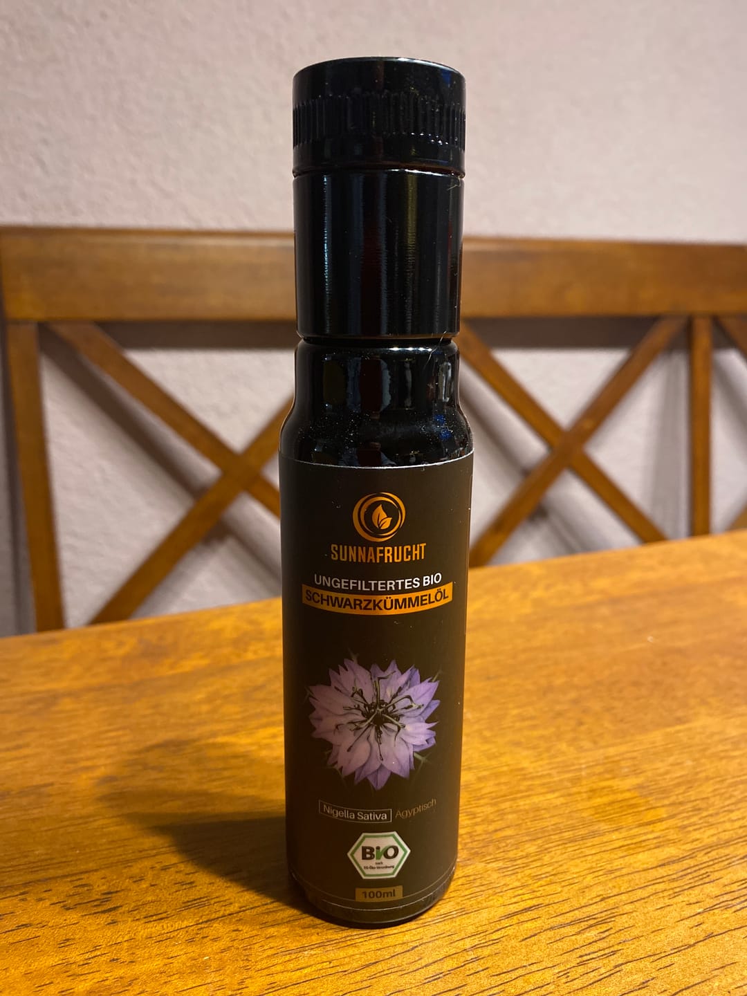 Kaltgepresstes Schwarzkümmelöl aus 1. Pressung mit natürlichem Thymoquinon-Gehalt sowie schützendem UV-Glas und Antioxidationsverschluss.